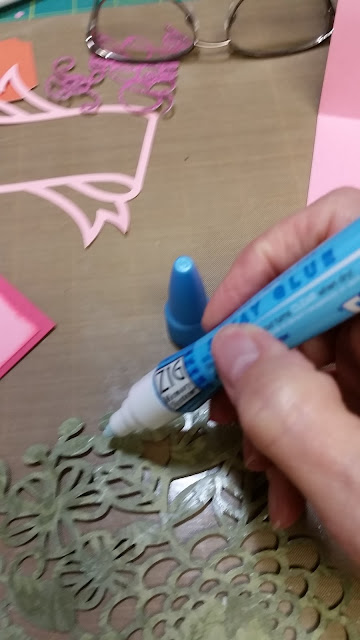 Here I'm gluing the back of the filigree with Zig 2-way glue and adding it to the pink layer.